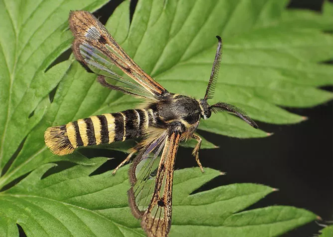 Бабочка стеклянница малинная (Pennisetia hylaeiformis) отличается прозрачными крыльями и темно-синим телом. Хотя взрослые особи относятся к отряду бабочек, они не похожи на типичных представителей этого отряда. Брюшко бабочки напоминает насекомое из семейства ос, потому что на брюшке есть желто-черные кольца. Брюшко самца отделано щеточкой из желтых волосков. Крылья бабочки прозрачные, с коричневым рисунком.