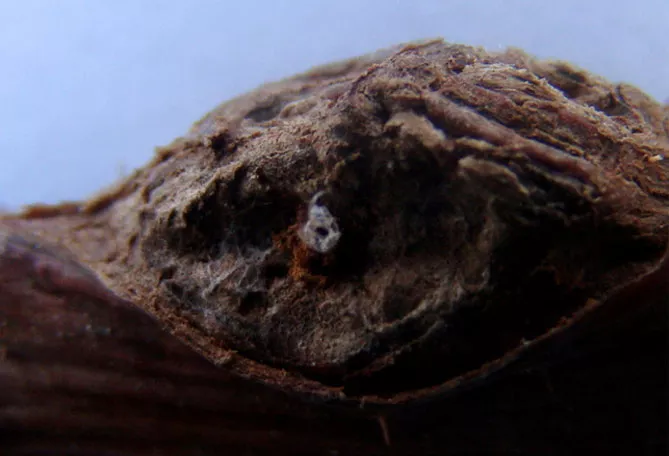 Кора отслаивается, в некоторых местах отстает от побега, создавая ворота для грибковых инфекций.
