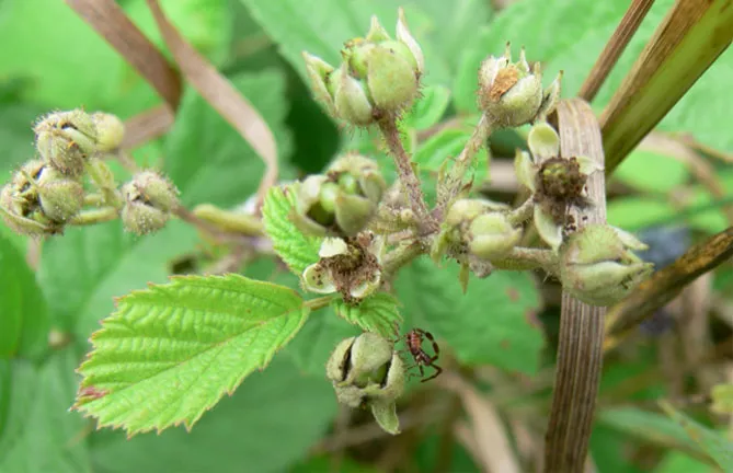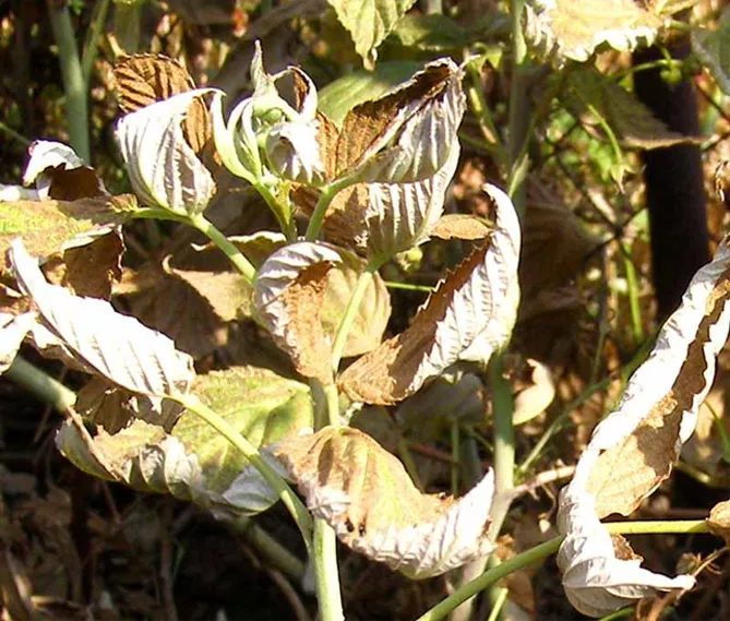 - Жаркий период в момент завязывания плодов способствует ускорению развития патогенов. Внезапно края листьев начинают подсыхать, побеги отмирают. Первоначальная диагностика усыхания побегов напоминает другое заболевание, называемое отмиранием побегов малины.