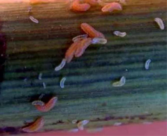 Розово-оранжевые личинки этой галлицы питаются корой малины, вызывая ее отслоения, побеги становятся коричневыми.