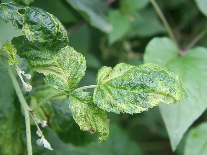 Хлороз прожилок листьев малины (Raspberry vein chlorosis virus) проявляется в первую очередь появлением (в основном летом) хлоротичных желтоватых пятен на поверхности листьев и их прожилок. Болезнь сначала поражает листья молодых побегов. Затем происходит более широкое по распространению пожелтение листьев малины, пластины листа деформируются, подсыхают по краям.