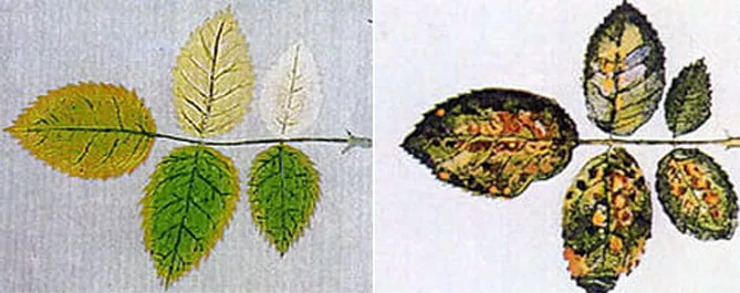 Фото. Внизу слева – хлороз, вызванный дефицитом железа, справа – дефицитом магния