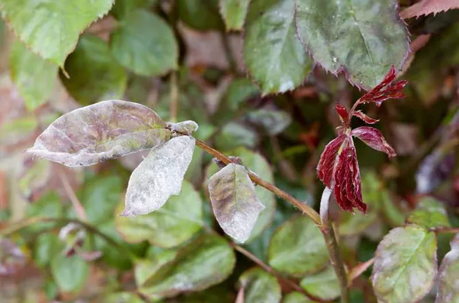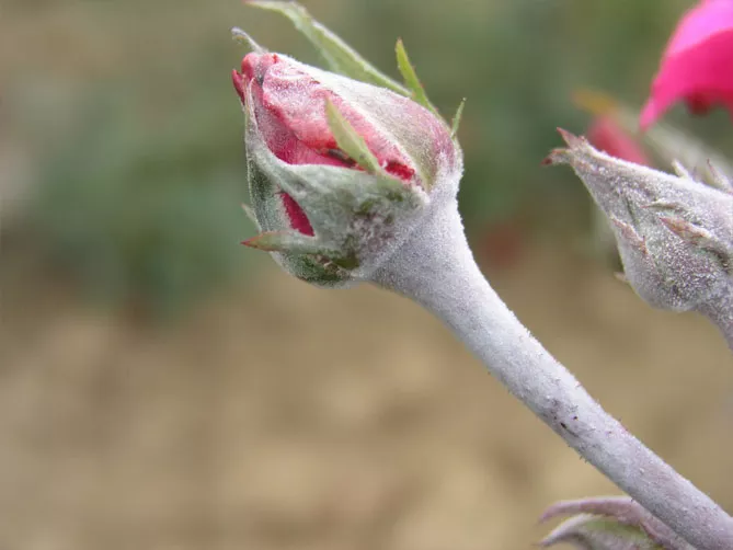 Самые первые симптомы не очень заметны и проявляются легким изменением цвета под листьями. Затем листья, бутоны и стебли покрываются пыльно-белым налетом, который расползается и утолщается. Пораженные листья деформируются, закручиваются вокруг средней жилки. Бутоны не могут полностью раскрыться. Этот гриб может сохраняться зимой на ветках, у основания шипов или почек.