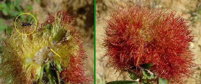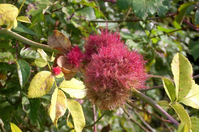 Мелкое насекомое из отряда перепончатокрылых Розанная орехотворка или диплолепис розанный (diplolepis rosae) откладывает яйца в ткани роз, вызывая образование галлов. Взрослая особь – насекомое длиной 5 мм, черноватого цвета, с сужающимся к спине брюшком. Ноги желтые или красноватые. Самка откладывает яйца в мае, зарывая в ткани растения. Личинки беловатого цвета развиваются внутри галла, который обеспечивает их питанием. Следующей весной вылупляются взрослые особи. Удалите пораженные части растений, не добавляйте их в компост.