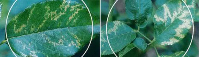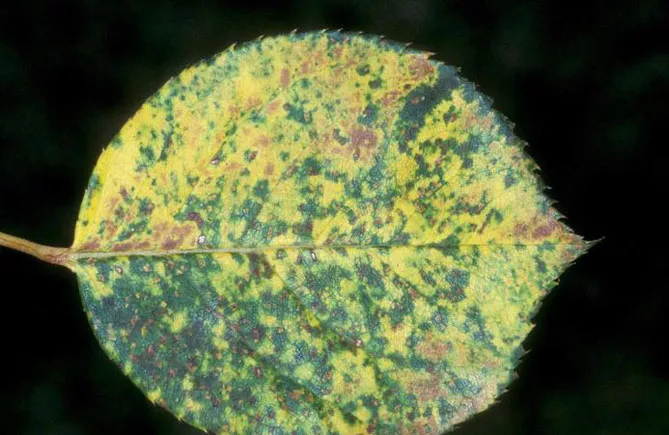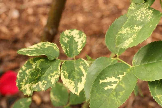 В начале лета нередко можно увидеть пятна на листьях, признак заражения вирусом мозаики. Вирус проникает в клетки и постепенно распространяется в растении. После заражения куст невозможно вылечить. Симптомы этой вирусной болезни роз различаются по степени тяжести: они могут варьироваться от обесцвечивания листьев до появления ярко выраженных желтых отметин.