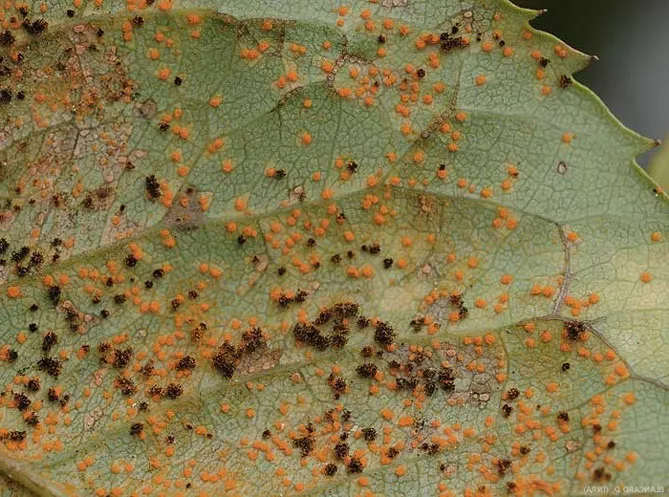 Симптомы: весной нижняя и верхняя стороны листьев, а также веточки покрываются мучнистыми округлыми оранжево-желтыми пустулами , быстро приобретающими черно-коричневый цвет. Многочисленные маленькие скопления являются спорами грибка. В случае сильного нападения болезни листья поражаются почти полностью, засыхают, опадают.