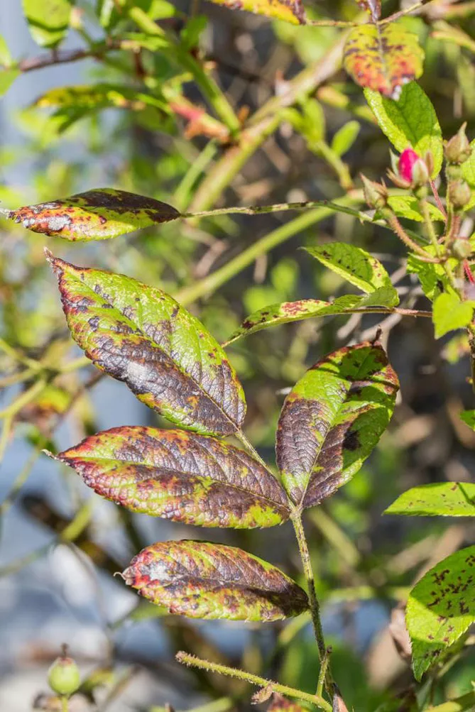 Симптомы: листья покрыты сверху круглыми черными пятнами с резкими очертаниями, отделенными друг от друга. Диаметр пятен составляет примерно 1-1,5 см. Несколько пятен могут объединяться, образуя большие черные пятна на листве зараженных роз. Остальная часть листовой пластины может желтеть полностью или только вокруг пятен. В жаркую влажную погоду по мере развития грибка пятна распространяются, листья желтеют, со временем опадают.