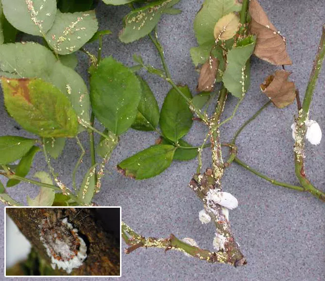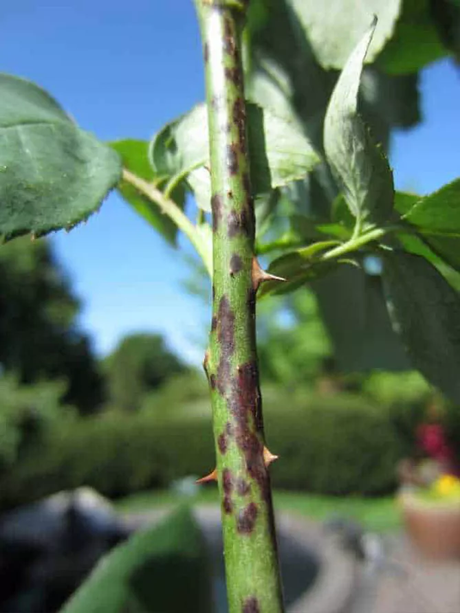Стебли и цветки могут быть отмечены пурпурно-красными пятнами, крапинками, которые потом темнеют. Куст оказывается почти без листвы, ослабевает. Пятна появляются в начале лета. Иногда розы полностью сбрасывают листья в сентябре. Это приводит к ослаблению пораженных кустов (недостаточно закаленные побеги не выдержат морозов).