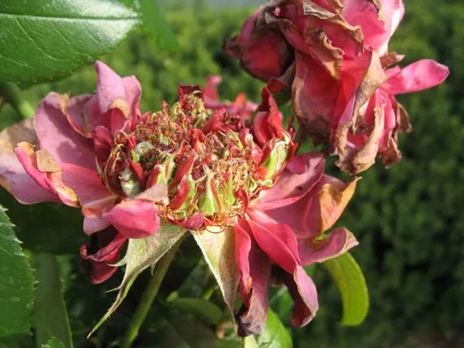 Вирус мелколистности (розеточности) роз распространяется микроскопическим клещом Phyllocoptes fructiphilus. Основной симптом – разрастание плотно сгруппированных, обычно ярко-красных, деформированных листьев. Пораженные побеги могут быть чрезмерно колючими, толще, чем здоровые, медленно созревают.