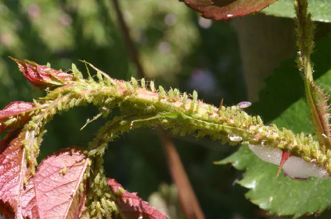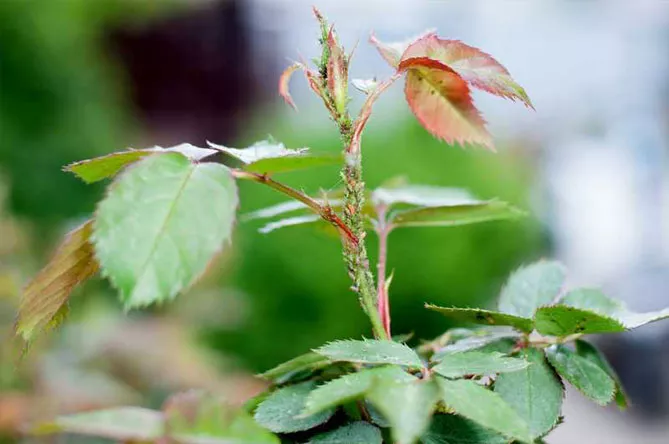 Симптомы: тля питается соком розы, ослабляя куст. Новые побеги становятся короче, рост замедляется, цветение также ухудшается.
