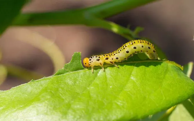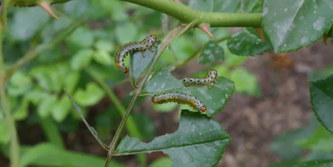 Светло-зеленые гусеницы с желтыми головками и черными пятнами поедают листья роз. На самом деле это ложные гусеницы — личинки насекомого Розанный пилильщик (Arge ochropus). Первая волна нападений приходится на май – июнь, вторая – летом.