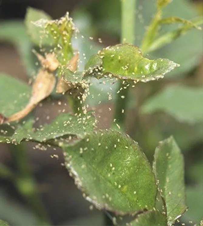 Красный паутинный клещ обычно атакует розовый куст, когда жарко. Клещи могут атаковать розы в период с мая по октябрь. Несложно заметить его нападение – листья становятся тусклыми, затем опадают. В качестве профилактики поливайте почву отваром хвоща и настоем крапивы.