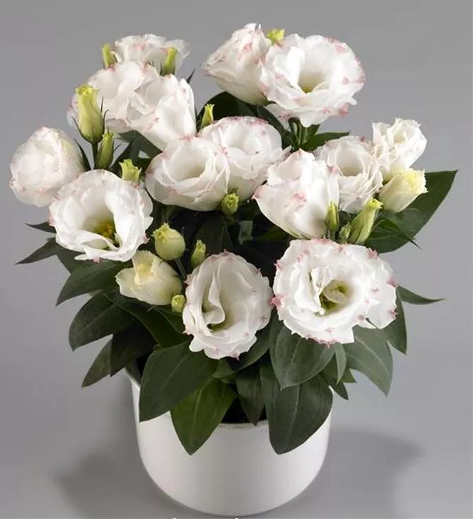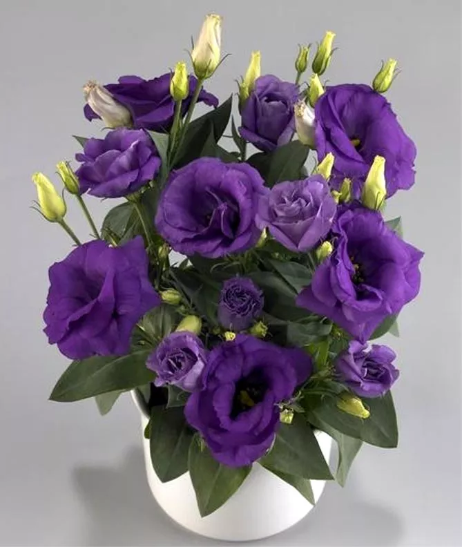 Первоначально цветок эустомы выглядит как типичное декоративное растение в горшке – у него красивые серо-зеленые листья и даже вне периода цветения он выглядит красиво. Молодой экземпляр начинает цвести только в следующем вегетационном периоде после посадки в горшок. Цветы обычно появляются в июле-августе. Одно горшечное растение может произвести много цветов, тогда горшок выглядит как плотный, красивый букет невесты.