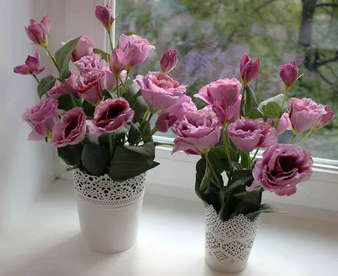 Эустома отлично смотрится в горшках дома. Она прекрасно украшает квартиры – нежные садовые цветы и декоративные листья придают каждой комнате необыкновенную изысканность, утонченность. Растения прекрасно смотрятся в горшках, после периода цветения очень декоративны, выглядят как красивые букеты цветов.