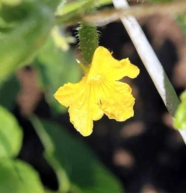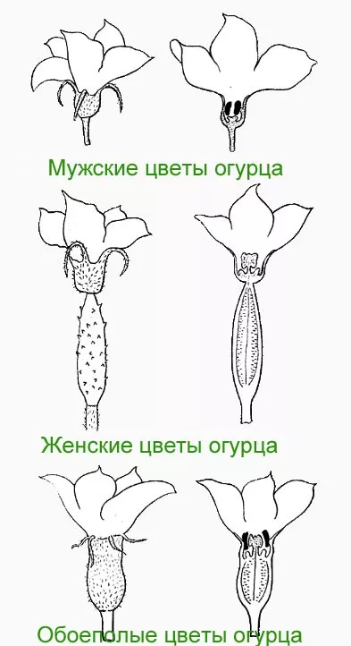 Первыми появляются мужские цветки, по отдельности или собранные в гроздья по 5-7 штук. Цветки растут на основных и боковых побегах. Затем исключительно на боковых побегах появляются женские цветки, обычно одиночные, реже по 2-3 штуки. Женские цветы легко узнать, у основания цветка виднеется маленький огурчик.
