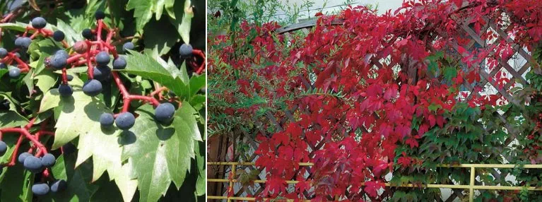 Листья дикого винограда состоят из 5 маленьких лепестков. Молодые побеги имеют красноватый окрас. Осенью виноград украшают алые красивые листья, которые летом зеленые. Цветки незаметные, зеленоватые, медоносные. Плоды – мелкие ягоды синего цвета.