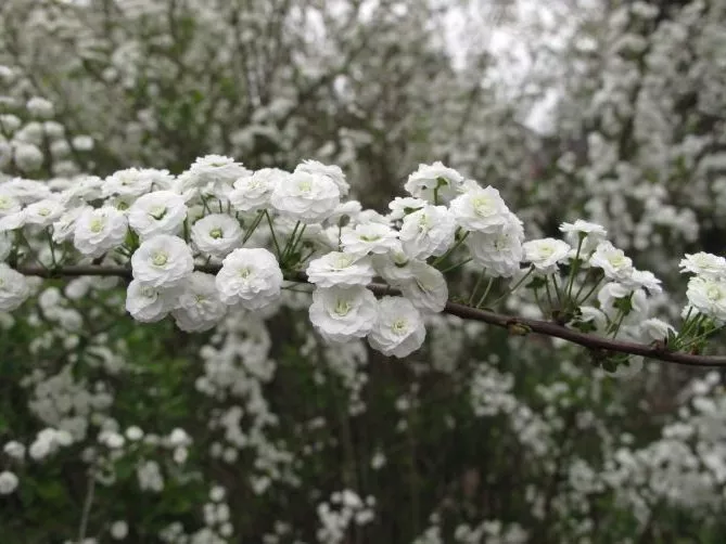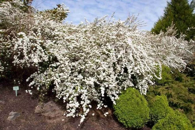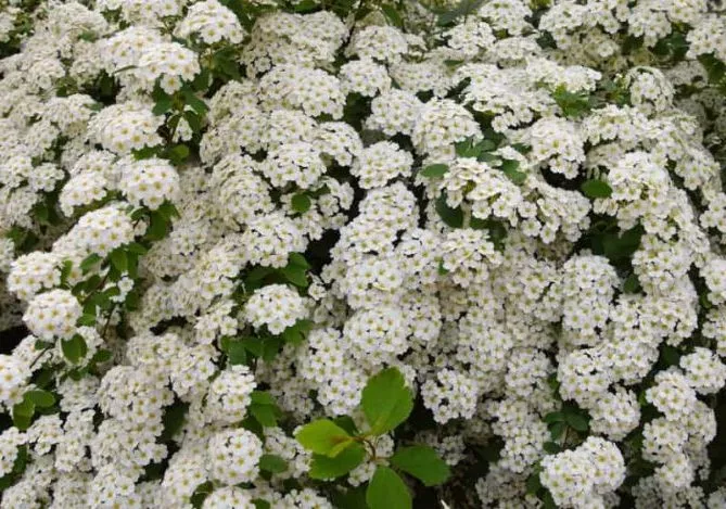 Спирея острозазубренная Аргута (Spiraea arguta) расцветает в конце апреля – мае. Растение еще называют Таволга, Лабазник. Создает крошечные белые цветки в таком изобилии, что побеги выглядят покрытыми снегом. За кустарником легко ухаживать, терпим к почве. Растет до 2 метров в высоту. Листья маленькие, эллиптические, светло-зеленые.