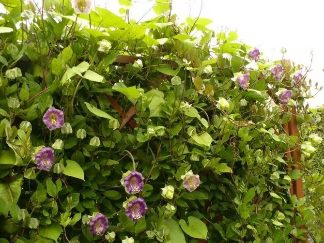 В нашем климате кобея выращивается как однолетнее растение. Высота лианы достигает 6 м. Цветки – крупные, колоколообразные появляются в июле – октябре. Цветки обычно имеют фиолетовый или синий цвет, иногда белый. Один цветок сохраняет декоративную ценность 1-2 дня.