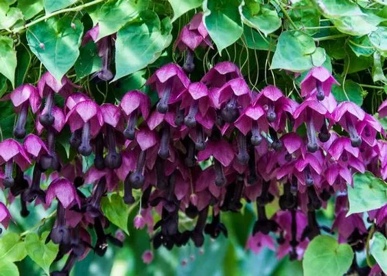 Rhodochiton в естественной среде растет в Мексике, как многолетний вьюн. В нашем климате выращивается как однолетнее растение. Побеги достигают длины 2 метра. Листья – зеленые, в форме сердца, с фиолетовыми пятнами. Цветы – оригинальной чашеобразной формы, фиолетового цвета. Цветение: июнь – сентябрь.