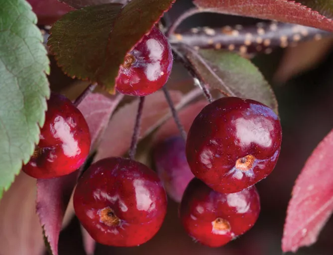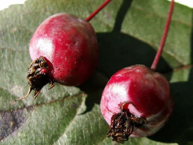 - Плоды Роялти. После цветения образуется множество мелких яблочек, похожих на вишенки, диаметром 1,5-2 см. Созревшие в конце лета плоды имеют темно-красный цвет. Очень ценимые птицами, яблочки остаются на растении до декабря. Обратите внимание, что этот сорт довольно чувствителен к бактериальному ожогу.