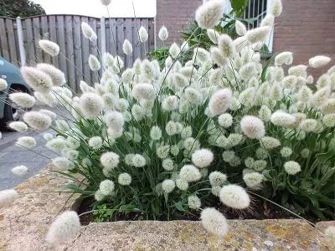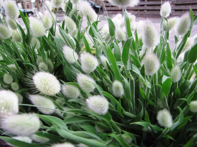 Декоративные соцветия эффектно выделяются в саду, при созревании они превращаются в шелковистые превосходные помпоны. Лагурус украшен довольно узкими листьями на длинных гибких стеблях.