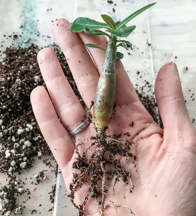 Сіянці адениума періодами виробляють враження, ніби зовсім не ростуть – це тому, що рослина непомітно розвиває каудекс, який росте вниз, збільшуючи розмір тієї частини, з якої ростуть корені.
