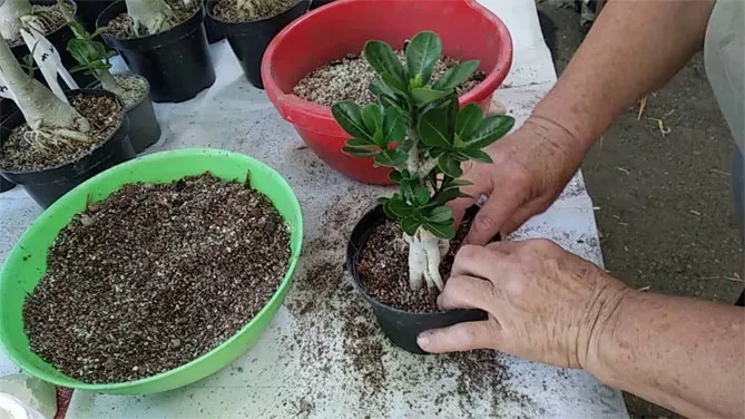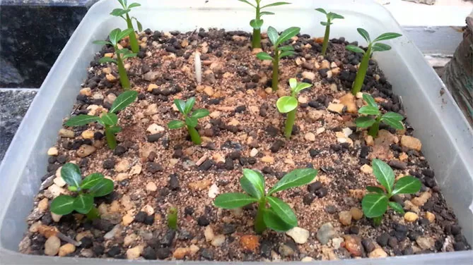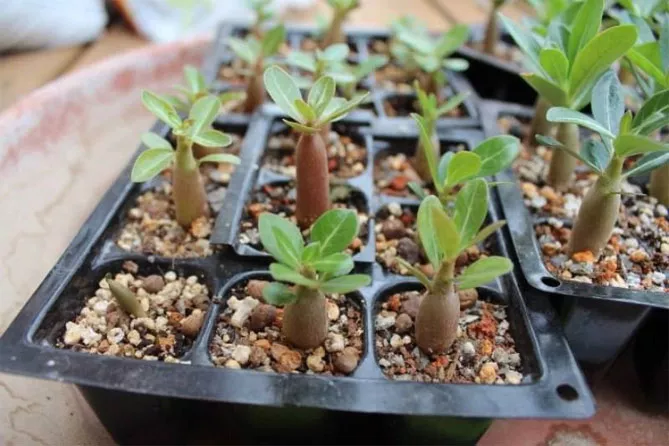 Щоб адениум добре розвивався, слід використовувати невеликі горщики. Можна пересаджувати розсаду в горщики через місяць після появи сходів.