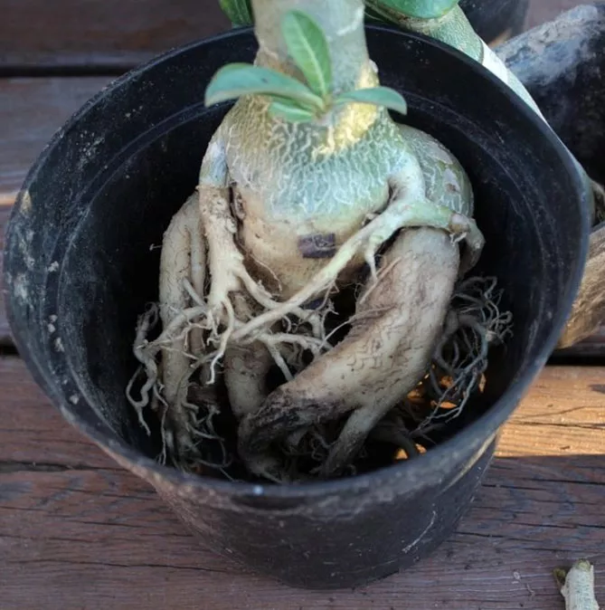 Троянда пустелі родом з Африки. Вона формує стеблокорінь (каудекс) – характерне потовщення біля основи рослини, яке використовується для накопичення води та поживних речовин. Над каудексом утворюються молоді пагони, з яких ростуть квіти.