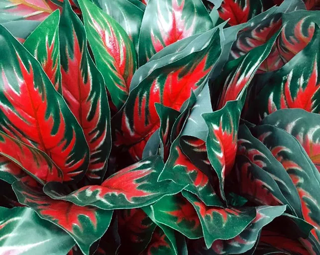 Листки великі, овальні та видовжені, досить товсті та м'ясисті, злегка підняті. Вони трохи нагадують листя дифенбахії, але виглядають привабливіше завдяки декоративним плямам на обох сторонах листової пластинки. Aglaonema дуже декоративна саме через сріблясті смуги, що додають листю привабливості.