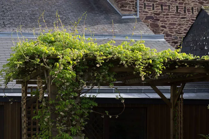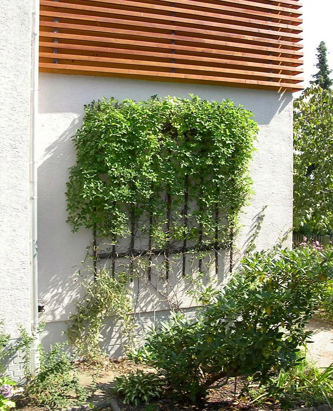 - Підв’язка, опора. Акебія потребує підтримки, стебла недостатньо жорсткі, щоб витримати її вагу. Достатньо спочатку підв’язати пагони до опори, потім вони будуть чіплятися за неї самі по собі. Ліана може притулятися до стіни, ковзати навколо дерева, вилазити на паркан, чіплятися за решітку. Можна обрати дерев’яну шпалеру, ПВХ або сталеву, що підходять для цих великих рослин. У середній смузі не варто садити акебію на решітку, потім буде складно зняти пагони для укриття на зиму. Деякі дуже гарні решітки можуть бути недостатньо міцними, щоб витримати вагу дорослої ліани.