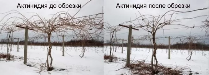 Найважливіша обрізка актинідії робиться, коли рослини перебувають у стані спокою. Актинідія потребує досить сильного скорочення пагонів. Необхідно обрізати всі пагони, які перетинаються, загущують рослину, ростуть знизу та всі непотрібні. Обрізають якомога більше пагонів, щоб крона краще освітлювалася.