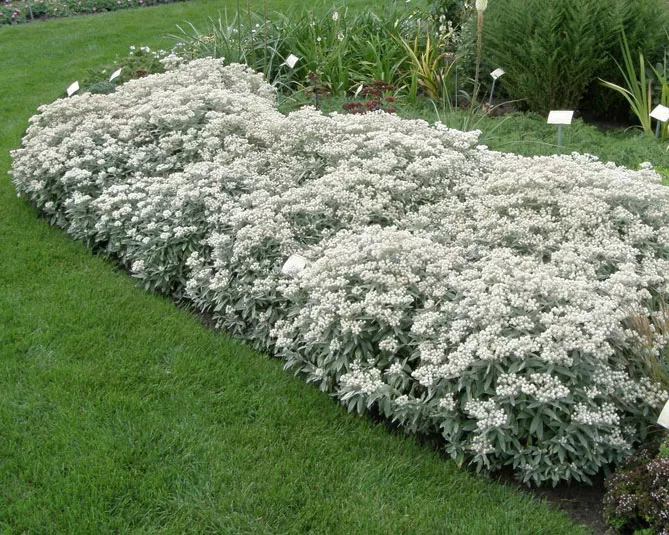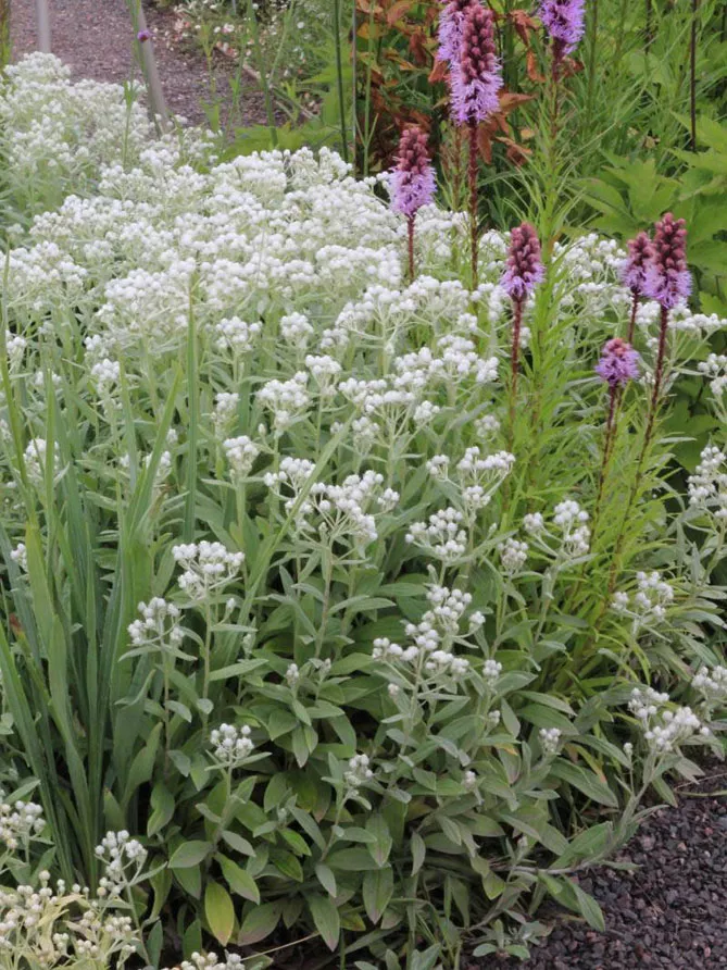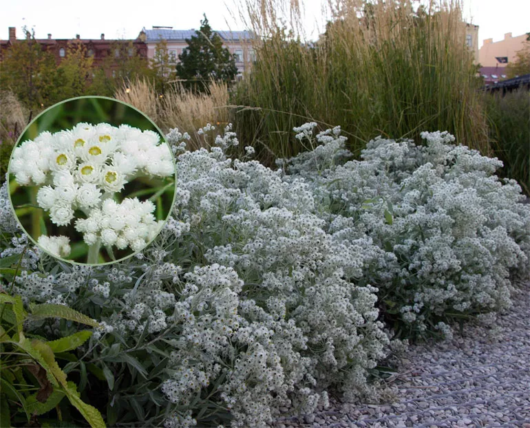 Вид анафаліс трижилковий (Anaphalis triplinervis) цвіте з липня по вересень. Висота у зрілості – 40 см. Дуже витривалий вид з рясними білими квітами та повстистим сірим листям прикрасить кінець сезону.