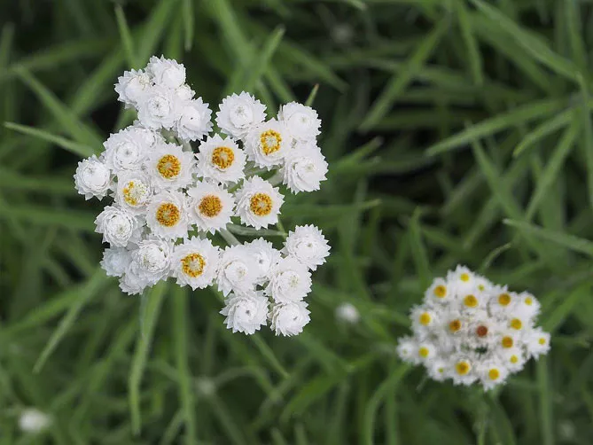Анафаліс альпійський або високогірний (Anaphalis alpicola) цвіте з липня по серпень. Висота у зрілості – 25 см. Цей альпійський вид утворює низький ґрунтовий покрив з сірим листям, вкритим тонким пухом. Дає гарні квіти для сухих букетів.