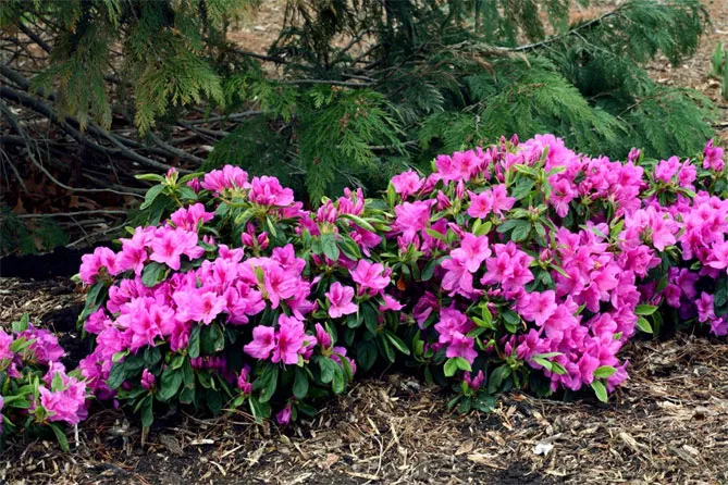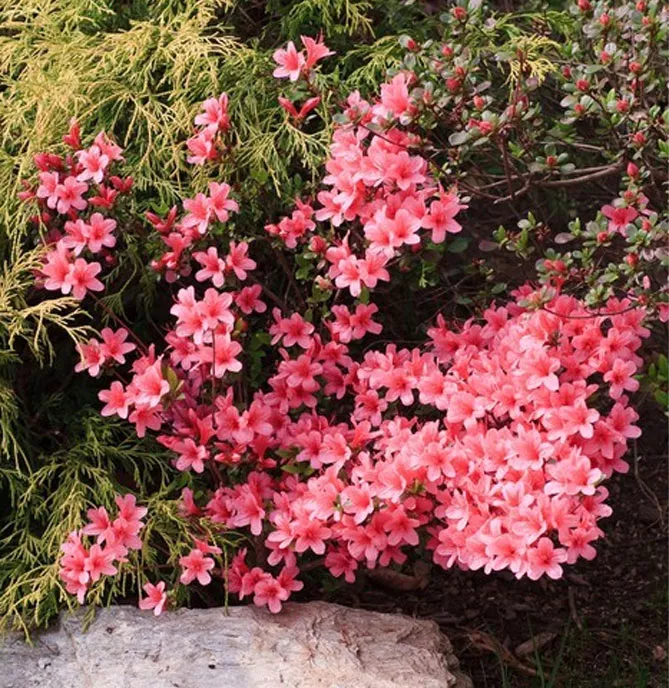 Хвойні чагарники стануть гарним доповненням до азалій – особливо сосни, які, крім цікавих форм і забарвлень, мають хвою, що мульчує і підкислює ґрунт.