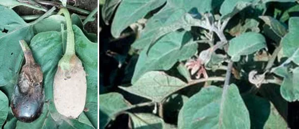 При високій вологості повітря в теплиці, парнику баклажани можуть бути заражені сірою гниллю (Botrytis cinerea), яка може розвиватися на пагонах, квітках і викликати їх відмирання, також вражає плоди (фото).