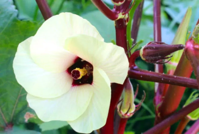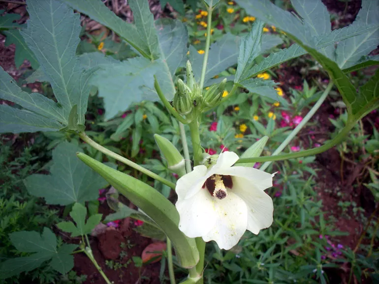 Як і гібіскус, бамія дуже швидко утворює досить високий кущ, вкритий гарною листкою та чудовими жовтими, рожевуватими, з пурпуровою чашечкою квітками.