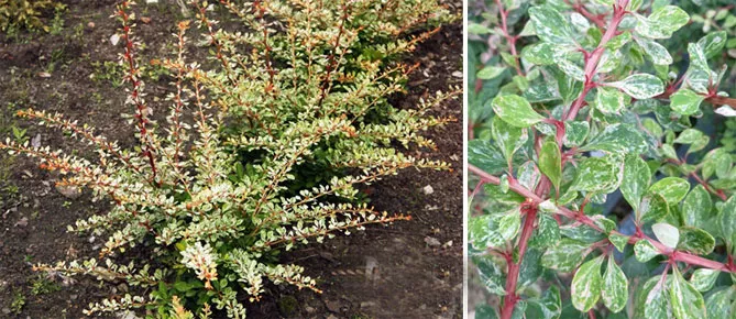 Пурпурнолистий барбарис, росте досить повільно. Фіолетово-червоні листки з зелено-золотим ободком, влітку листя забарвлюється у колір старого золота. Цвіте в кінці травня – початку червня. Віддає перевагу слабокислим ґрунтам.