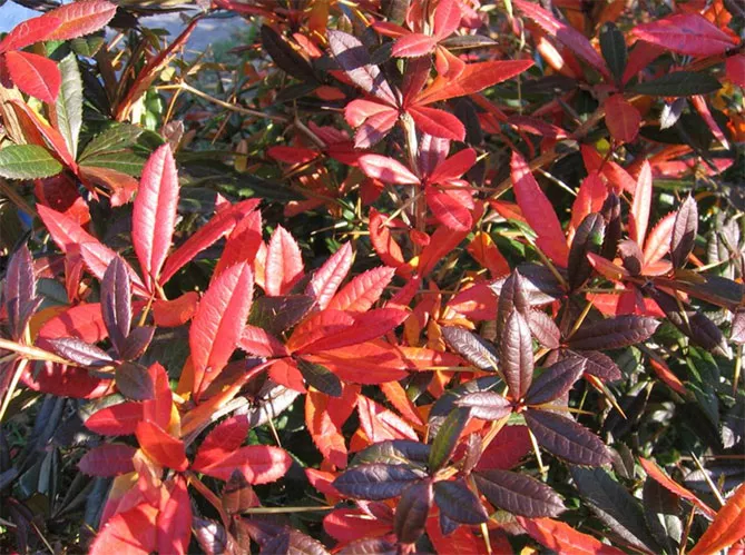 - Листки двокольорові – червоні зверху, темно-зелені внизу, пагони темно-червоні.