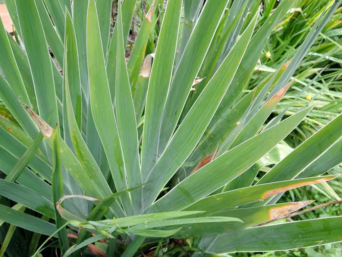 - Грибкова хвороба гетероспоріоз проявляється навесні у вигляді невеликих круглих плям на верхівці листя, які в міру росту деформуються. Потім листя повністю висихає, уражаються квітконоси. Без лікування гриб зимує на хворих листках, щоб знову з'явитися наступної весни. Ірис урешті-решт гине від виснаження запасів. При гетероспоріозі на початку хвороби потрібно зрізати уражені листки і спалити. Також можна обприскати сусідні здорові рослини для профілактики бордоською сумішшю з інтервалом 2 рази на місяць. Не поливайте листя ірисів і обережно збирайте відмерлі листки, як тільки закінчиться вегетація, щоб уникнути повторного зараження в наступному році.