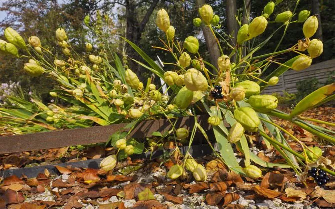 Після зів'яння квіти поступаються місцем великим грушоподібним зеленим стручкам з трьома відділеннями, які з віком стають бежевими. При дозріванні стручки розкриваються, вивільняючи великі блискучі чорні насінини, які також мають декоративне значення.