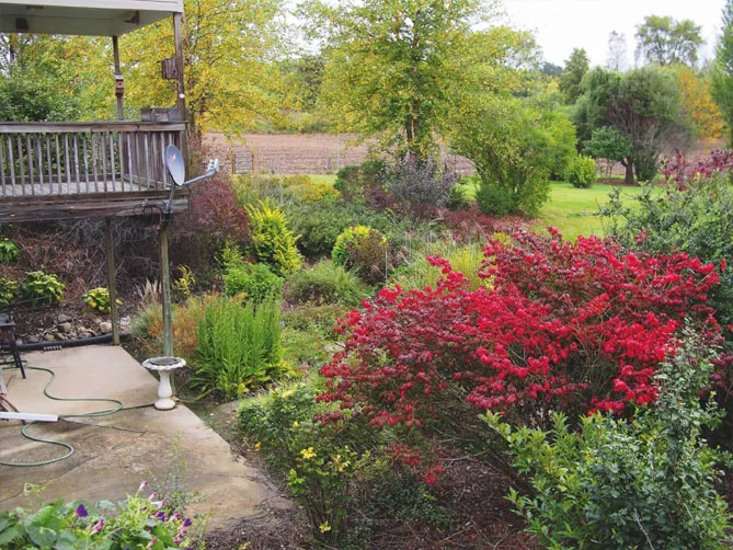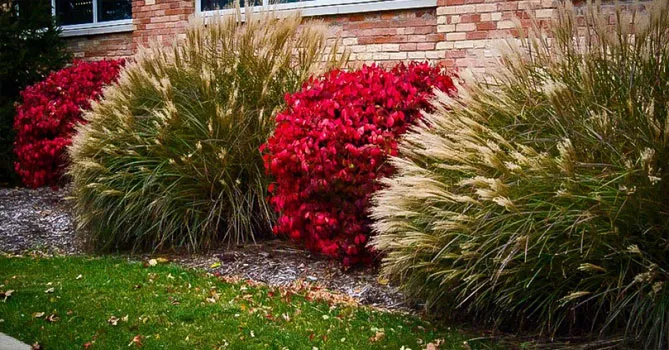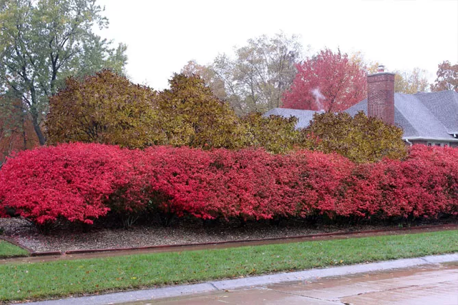Фото. Бересклет крилатий у ландшафтному дизайні саду – солітер і у вигляді огорожі, у композиціях з іншими рослинами.