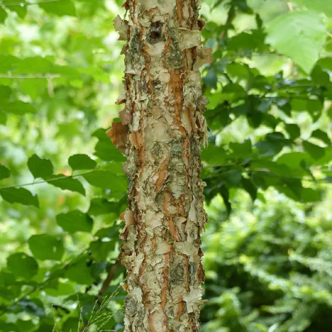 Кора залишається тонкою, розшаровується на пергаментні смужки, демонструючи ніжні відтінки білого, вохристого і рожевувато-бежевого кольорів, як у Betula utilis. Біла китайська береза Betula albosinensis має блідо-мідно-червону кору, Б. Максимовича (Betula maximowicziana), що цінується за довгі квіткові сережки, з віком набуває гарну сіро-білу або помаранчеву пергаментну кору.