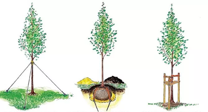 Схема посадки берези залежить від сорту, наприклад, повисла береза може досягати 25 метрів, але більшість сортів набагато нижчі. Відстань між березами при посадці має бути не менше 2 м. Після посадки обов'язково потрібно встановити опори, оскільки молоді саджанці прищеплені на дуже тонкі підщепи, при сильному вітрі рослина може зламатися.