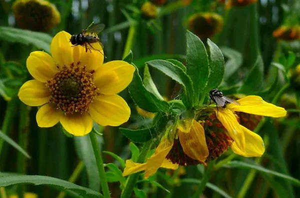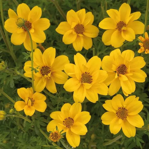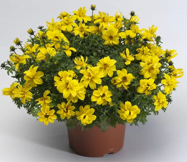 Цветки биденса диаметром 3-4 см, желтые или оранжевые. В зависимости от сорта бывают простые или махровые, могут иметь разную окраску внутренней корзинки. На самом деле это не цветы, а соцветия с широкими краевыми цветками и трубчатыми срединными цветками. Сорта с повышенным количеством краевых цветков (лепестков) появились совсем недавно.