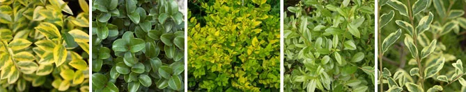 Фото. Листя бирючини: Б.японська, сорт «Ауреум», Б. Вікарій, Б. звичайна «Атровіренс», Б. ібота «Мюслі».