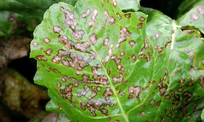 - нерівномірні спочатку сіро-зелені, потім коричневі плями світлішого забарвлення, ніж при церкоспорозі та дрібнішого розміру (діаметром 5-10 мм), неправильної форми;