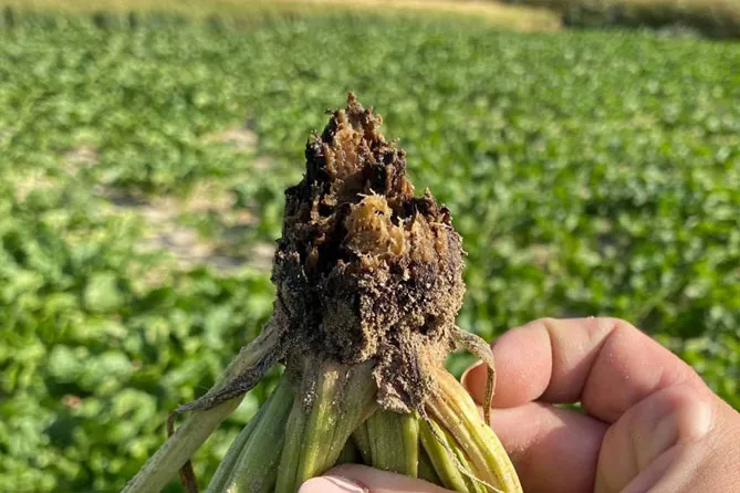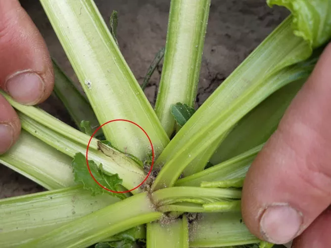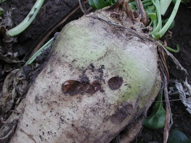 - У разі зараження грибом Rizoctoni solani пошкоджується бічна поверхня кореня. Пошкоджена бічна тканина має темно-синій та чорний колір, глибокі тріщини. Листя в'яне, основи та головка кореня загнивають.