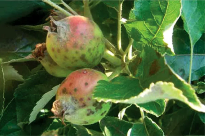 Фото. Ознаки хвороби на листках яблуні та молодих плодах.