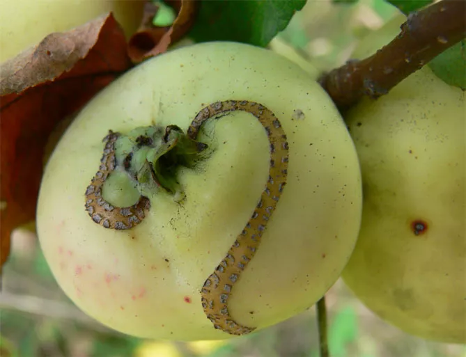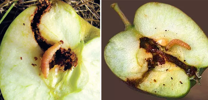 Ще один шкідник, якого легко побачити під час огляду саду – яблунева плодожерка, яка вражає плоди. Шкідник поширений повсюдно, але найбільшу небезпеку представляє в південних регіонах. Найбільш чутливі сорти раннього дозрівання – Мелба, Білий налив та інші і середнього – Кандиль Сінап. Також сильно вражає деякі пізні сорти – Ренет Сіміренко, Ренет Шампанський, Сари Сінап.