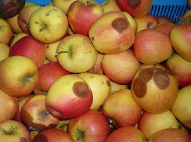 Фото. Яблука, що зберігаються, заражені гіркою яблучною гниллю.